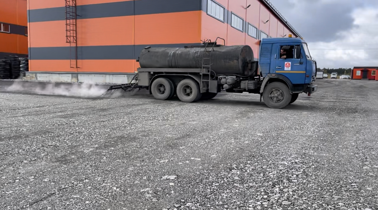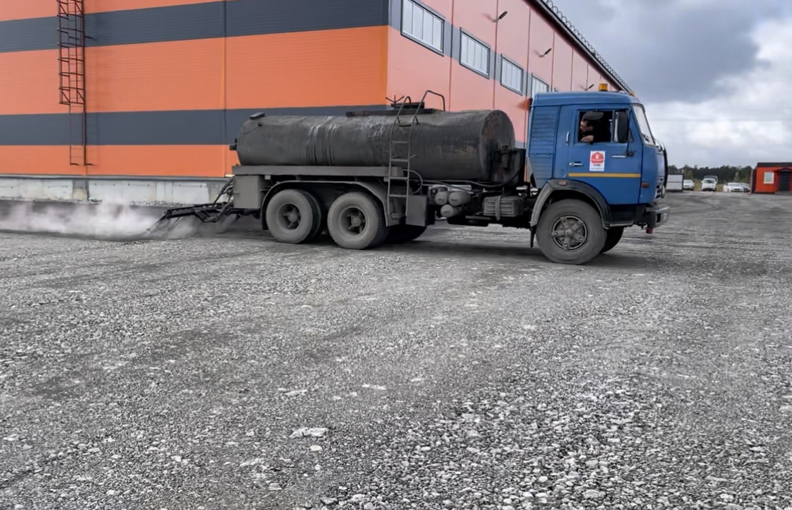 Битумная прошивка: Наша асфальтная крошка с укладкой обязательно проливается битумной эмульсией Под солнцем и весом машин она «спекается» в монолит, сравнимый с асфальтобетоном.